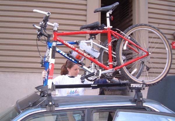 Claire getting her bike off the bike rack. We didn't want to get up extra early to ride downtown to the start.