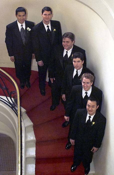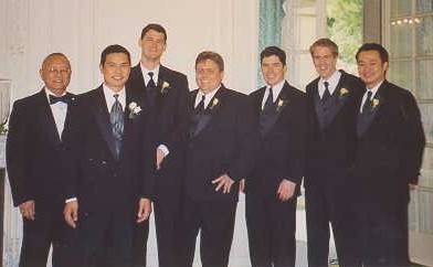 The next incident and comic relief (funny after the incident was solved) would be supplied by Brian Coyle. As Brian dressed in the middle of the room, he turns to everyone and says, "Hey guys... Why does my shirt look different than all of yours?". Everyone was laughing except for me. All I could think was... "What are we going to do now? There was a Tux shop across from the hotel." Then some yelled out, "You have it on inside out." and more laughter ensued and I sighed with relief. Brian checked his shirt and sure enough... it WASN'T inside out. The tux shop had sent him with the wrong style shirt. But my father was prepared, just as he had preached over and over to me growing up. Emergency sewing kits, handkerchiefs, and tuxedo shirts???... Sure enough, he had an extra tux shirt and it was almost the exact style as the ones we rented and it fit Brian. Way to go Dad!