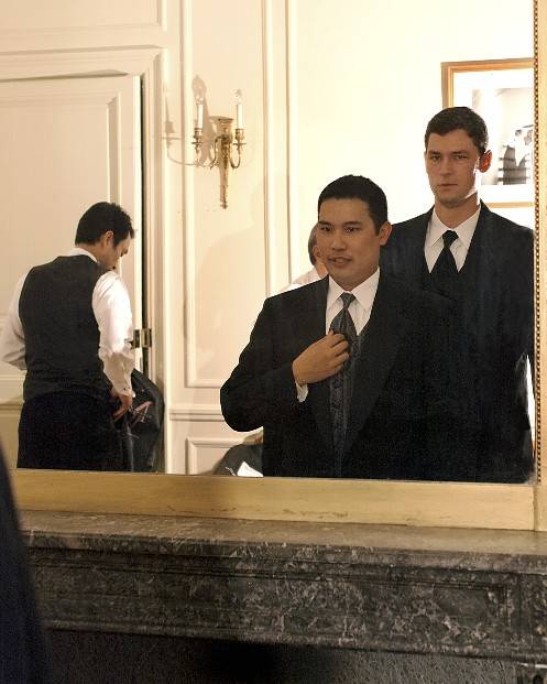 The first incident while getting dressed was with Dean's vest. One of his vest buttons popped off. Luckily, I had an emergency sewing kit in my toiletries bag. Anyone who knows me, knows that I like to be prepared for anything and everything. My father is the one I can thank for this he would always tell me to keep a little hotel sewing kit in my toiletries bag and to have a handkerchief. It was a proud moment when he was there and I had the sewing kit.